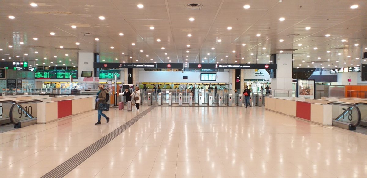 El acceso a las vías del tren en el vestíbulo de la estación de Barcelona-Sants durante el estado de alarma por la pandemia de coronavirus. - RENFE