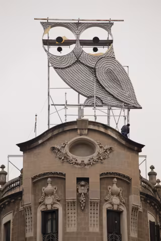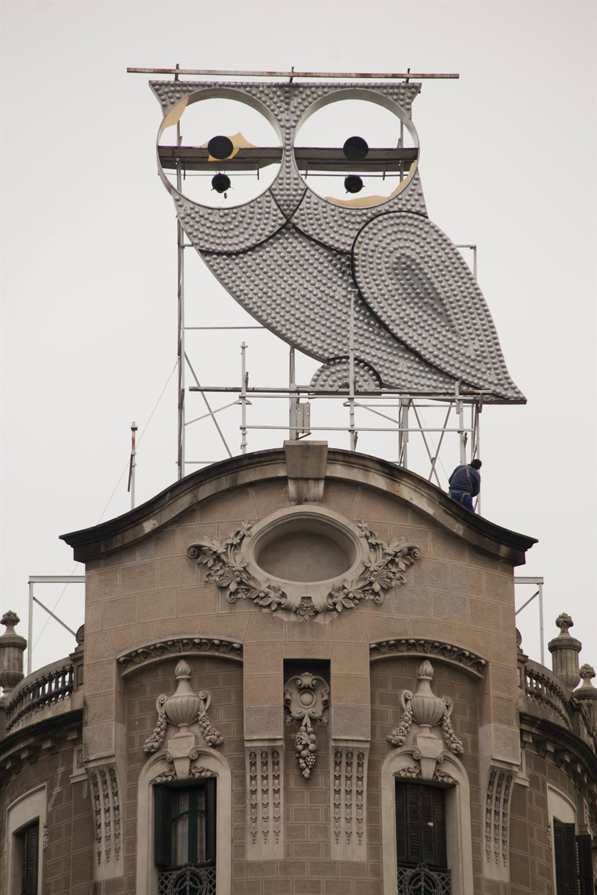 El histórico rótulo publicitario del búho que preside la intersección de Barcelona entre la avenida Diagonal y el paseo de Sant Joan ha empezado a ser restaurado, y volverá a brillar por las noches.