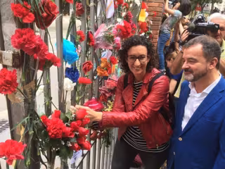 Rovira ha colocado un clavel en la puerta del colegio Ramon Llull, donde el domingo actuó la Policía Nacional contra los vecinos que protegían el centro, acompañada del líder republicano en Barcelona Alfred Bosch.