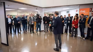 El director de RTVE Catalunya, Esteve Crespo, y la directora de Participación y Comunicación de RTVE, María Eizaguirre, han dado la bienvenida a los visitantes este sábado, entre los que había representantes institucionales y de otros medios de comunicación.
