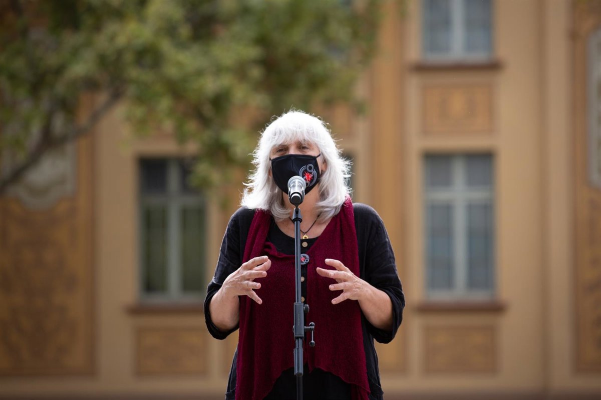 La líder de la CUP en el Parlament, Dolors Sabater, en el acto del cuarto aniversario del 1-O ante la Escuela Ramon Llull - DAVID ZORRAKINO - EUROPA PRESS