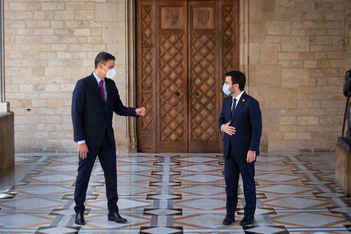 El presidente del Gobierno, Pedro Sánchez (i), y el de la Generalitat, Pere Aragons (d), a su llegada para la reunión en el Palau de la Generalitat - David Zorrakino - Europa Press