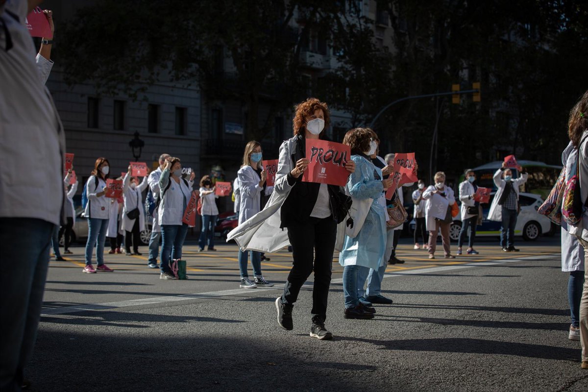 Facultativos de los Centros de Atención Primaria (CAP) del Instituto Catalán de la Salud (ICS) sostienen pancartas donde se puede leer "¡Basta!" - David Zorrakino - Europa Press