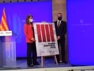 La consellera de Presidencia y portavoz del Govern, Meritxell Budó, y el vicepresidente primero del Parlament, Josep Costa, presentando el cartel de la Diada de este año. - EUROPA PRESS