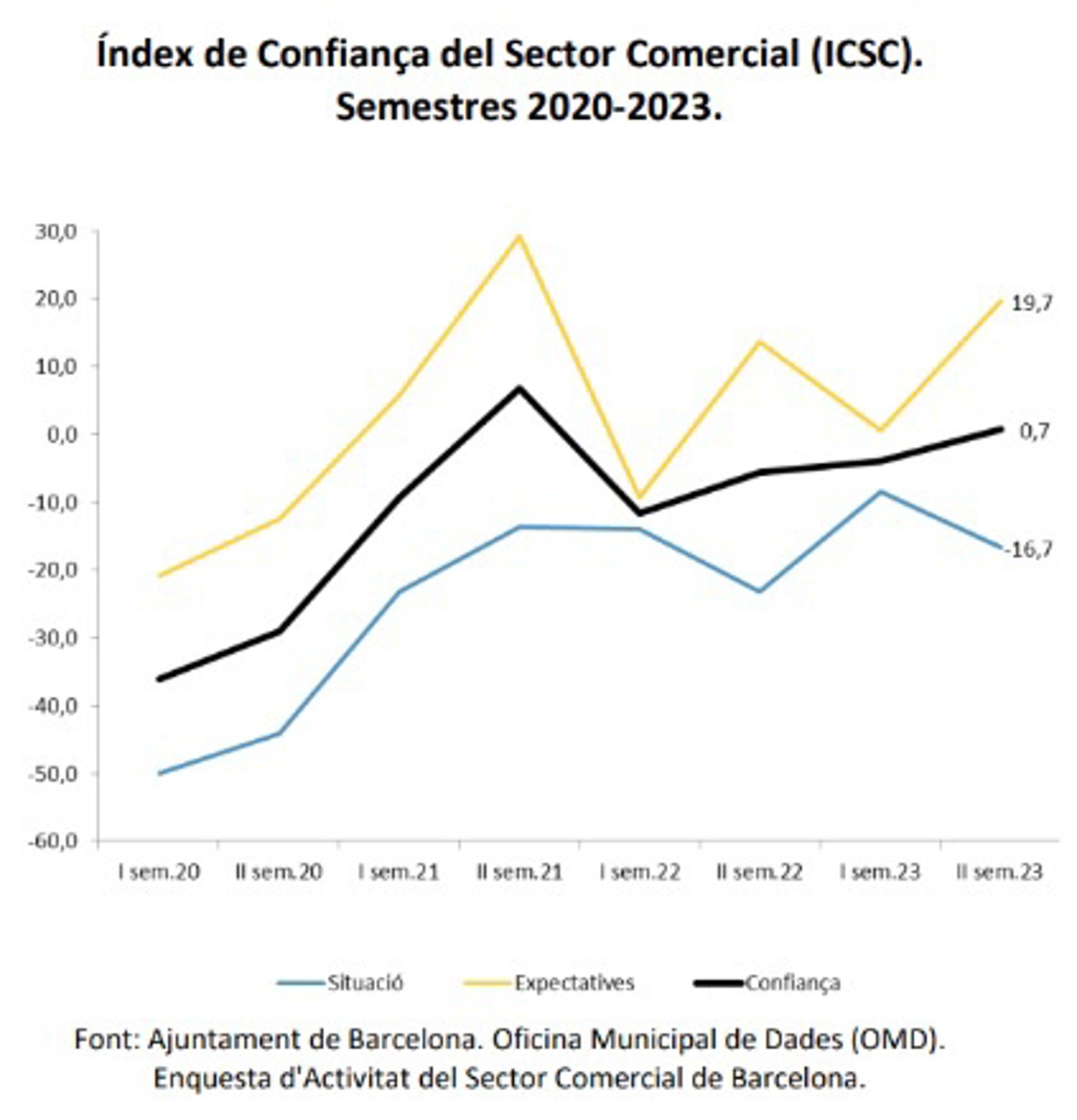 El Índice de Confianza del Sector Comercial (ICSC) de Barcelona fue de 0,7 puntos en 2023, lo que supone 5,7 puntos más que el año anterior y casi 37 más que el primer semestre de 2020, informa este sábado el Ayuntamiento en un comunicado.