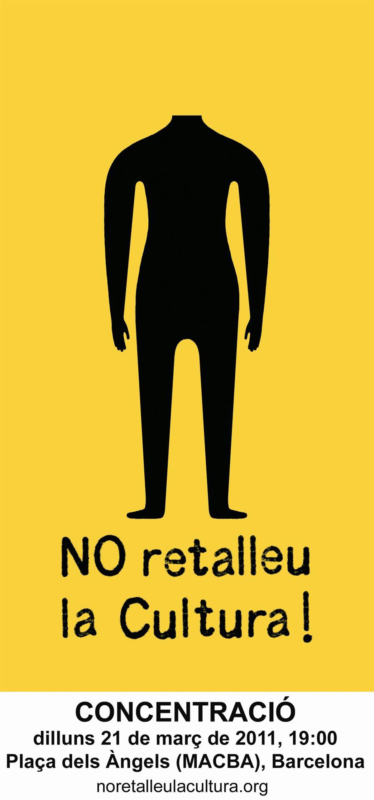 La plataforma 'No retalleu la Cultura', formada por más de 80 asociaciones del sector, se manifestará este lunes a las 19.30 horas en la plaza dels Àngels de Barcelona para evidenciar su malestar ante el descenso presupuestario anunciado por la Generalitat en el sector, ya que consideran que les afectará de una forma irreversible.