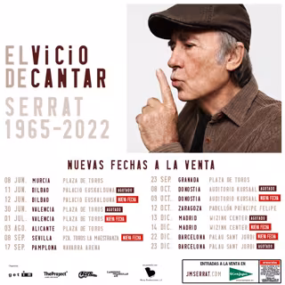 El cantautor barcelonés Joan Manuel Serrat ha anunciado nuevas fechas de su gira de despedida 'El vicio de cantar 1965-2022' en las ciudades de Barcelona, Madrid, Valencia, Bilbao y San Sebastián, tras agotar en pocas horas las entradas, e incorpora a Sevilla a la gira.