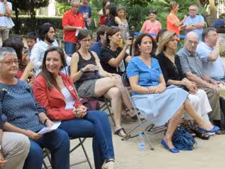 Como muestra de la presencia que tendrá el 1-O en la Diada, se han sumado a la presentación de este viernes Roger Español, que perdió la visión de un ojo por la actuación policial durante el referéndum; el actor Joan Lluís Bozzo y los integrantes de una de las mesas de votación de la jornada.
