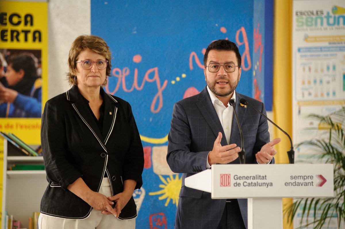 La consellera Anna Simó y el presidente Pere Aragons en el acto de inauguración del curso escolar 2023-2024 en la escuela Merc Rodoreda de Barcelona - ALBERTO PAREDES - EUROPA PRESS