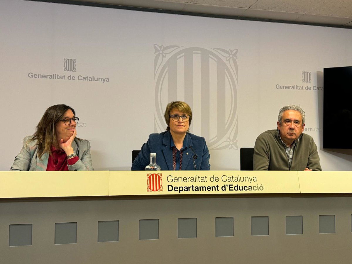 La secretaria general de Educación de la Generalitat, Patrícia Gom; la consellera de Educación, Anna Simó; y el secretario de Transformación Educativa de la Generalitat, Ignasi Garcia Plata, en rueda de prensa este jueves en Barcelona - EUROPA PRESS