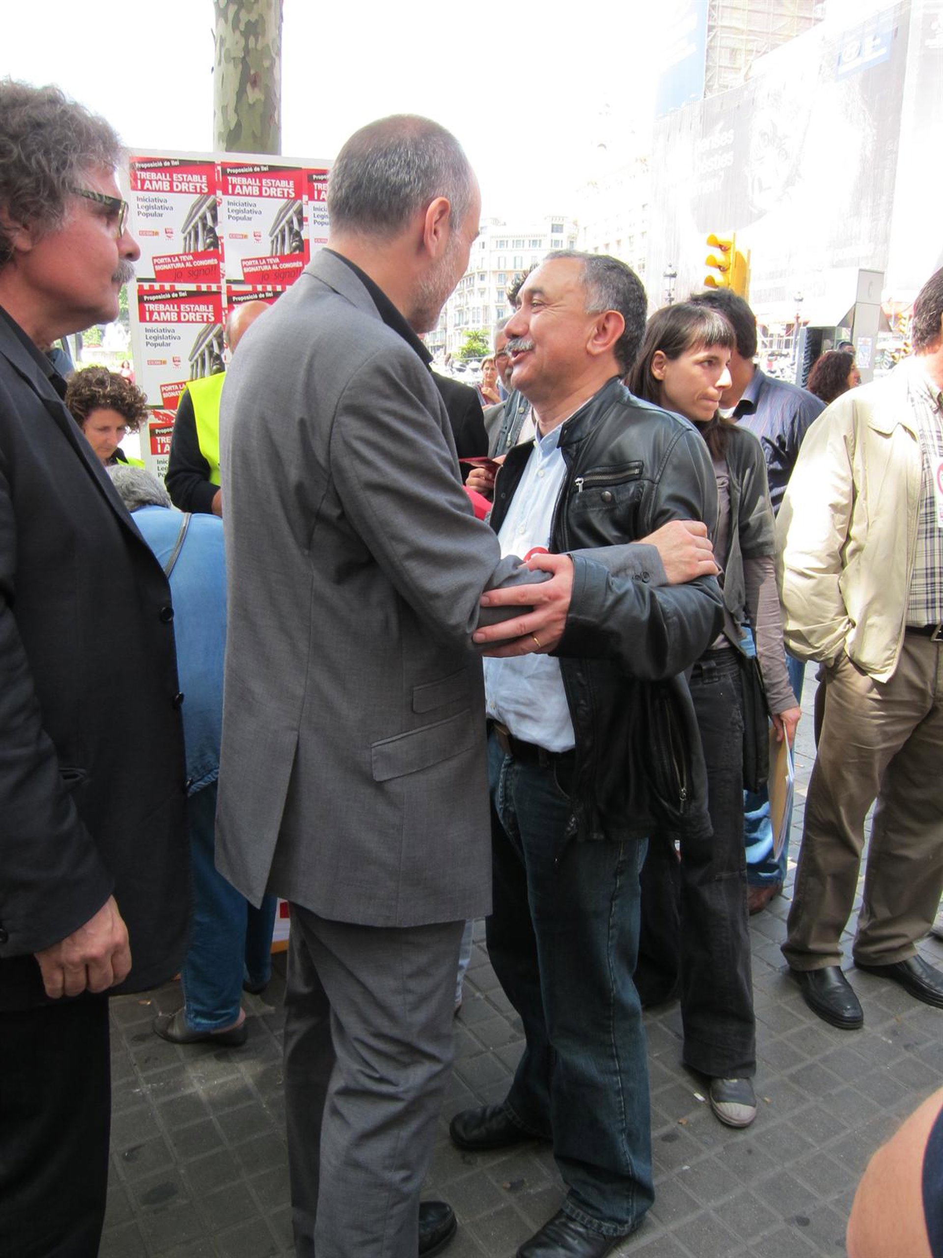 Los secretarios generales de CC.OO. y UGT de Catalunya, Joan Carles Gallego y Josep Maria Álvarez, han participado este viernes en un acto de recogida de firmas en la plaza Catalunya de Barcelona, al que también han participado los secretarios generales de ICV y ERC, Joan Herrera y Joan Ridao, el alcaldable por ICV en Barcelona, Ricard Gomà, y el diputado de ERC en el Congreso Joan Tardà.