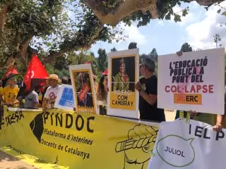 También portaban una pancarta con la fotografía del exconseller Josep Gonzlez-Cambray en la que ponía 'Liquidado', y otra con una imagen de la nueva consellera, Anna Simó, con la frase 'No haga como Cambray'.