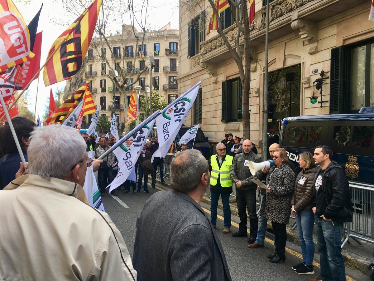 Sindicatos de policía local y Mossos d'Esquadra se han concentrado este viernes por la mañana delante de la Delegación del Gobierno en Barcelona para reclamar la jubilación anticipada de los agentes a través de un manifiesto dirigido al ministro de Hacienda y Función Pública, Cristóbal Montoro.