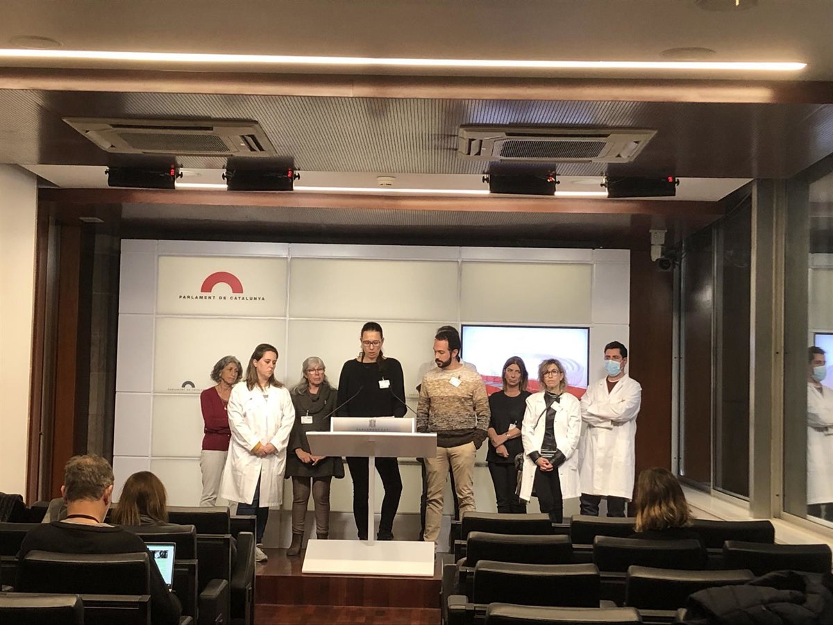 Rueda de presa de la Mesa sindical de la sanidad de Catalunya este jueves en el Parlament. - EUROPA PRESS