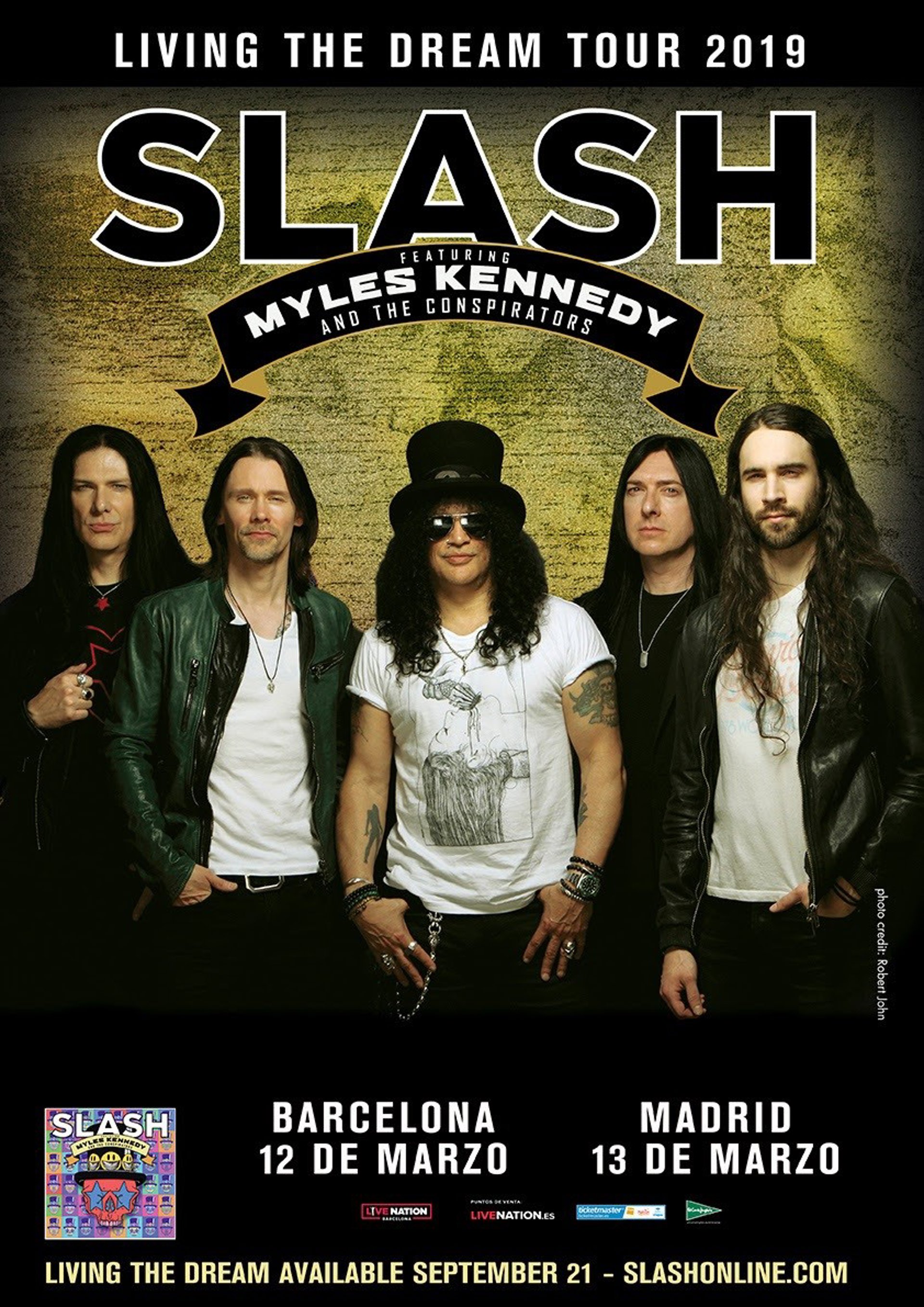 Slash actuará en Barcelona y Madrid el 12 y 13 de marzo del próximo año, respectivamente, junto a Myles Kennedy & The Conspirators para presentar su nuevo disco 'Living the dream', que verá la luz el 21 de septiembre.