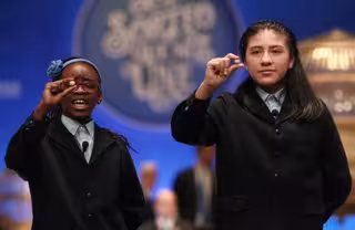 Dos de las niñas de la residencia de San Ildefonso, cantan uno de los quintos premios de la Lotería de Navidad, durante la celebración del Sorteo Extraordinario de la Lotería de Navidad 2019 en el Teatro Real de Madrid (España), a 22 de diciembre de 201 - Eduardo Parra - Europa Press