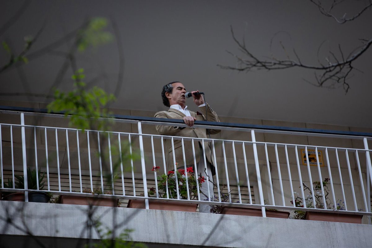 El cantante de ópera y crooner Stefano Palatchi ofrece un concierto desde su balcón en Barcelona (España) el 24 de abril de 2020 (archivo). - David Zorrakino - Europa Press