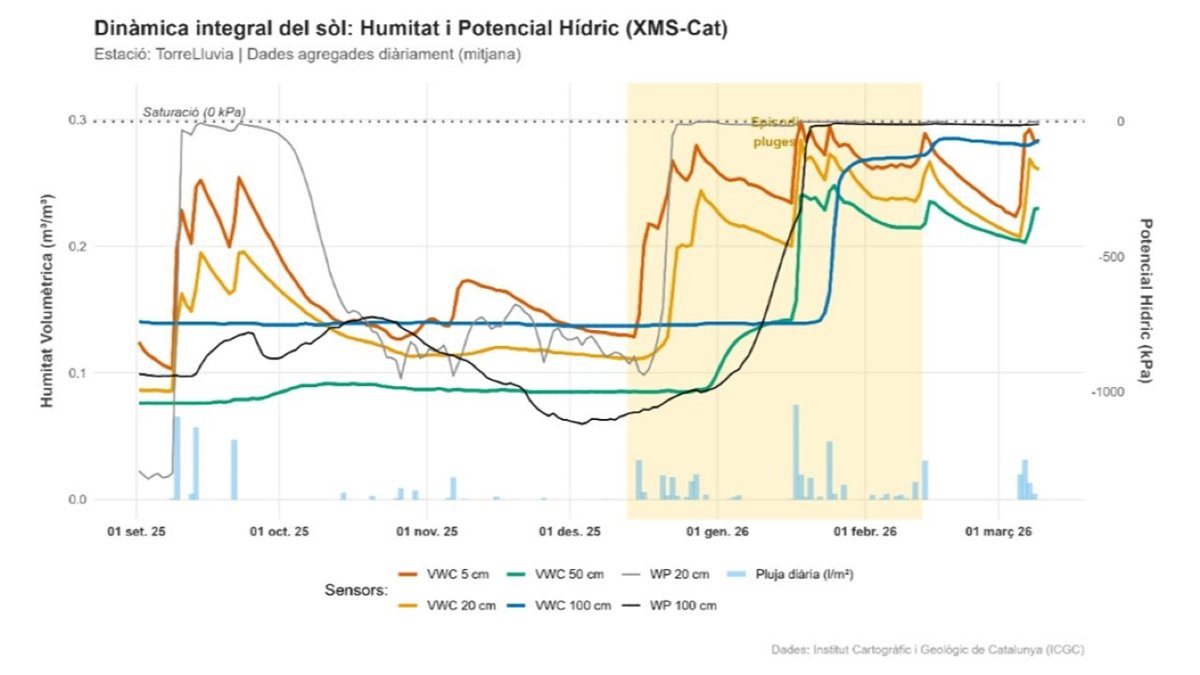 El suelo catalán ha alcanzado el "nivel máximo" de recarga de agua después de las lluvias registradas durante el invierno meteorológico, una situación de saturación que se generó de forma simultánea en todas las estaciones equipadas con sensor hídrico del Institut Cartogràfic i Geològic de Catalunya (ICGC) entre el 16 y 17 de diciembre de 2025, y que se mantiene prácticamente igual tres meses después.