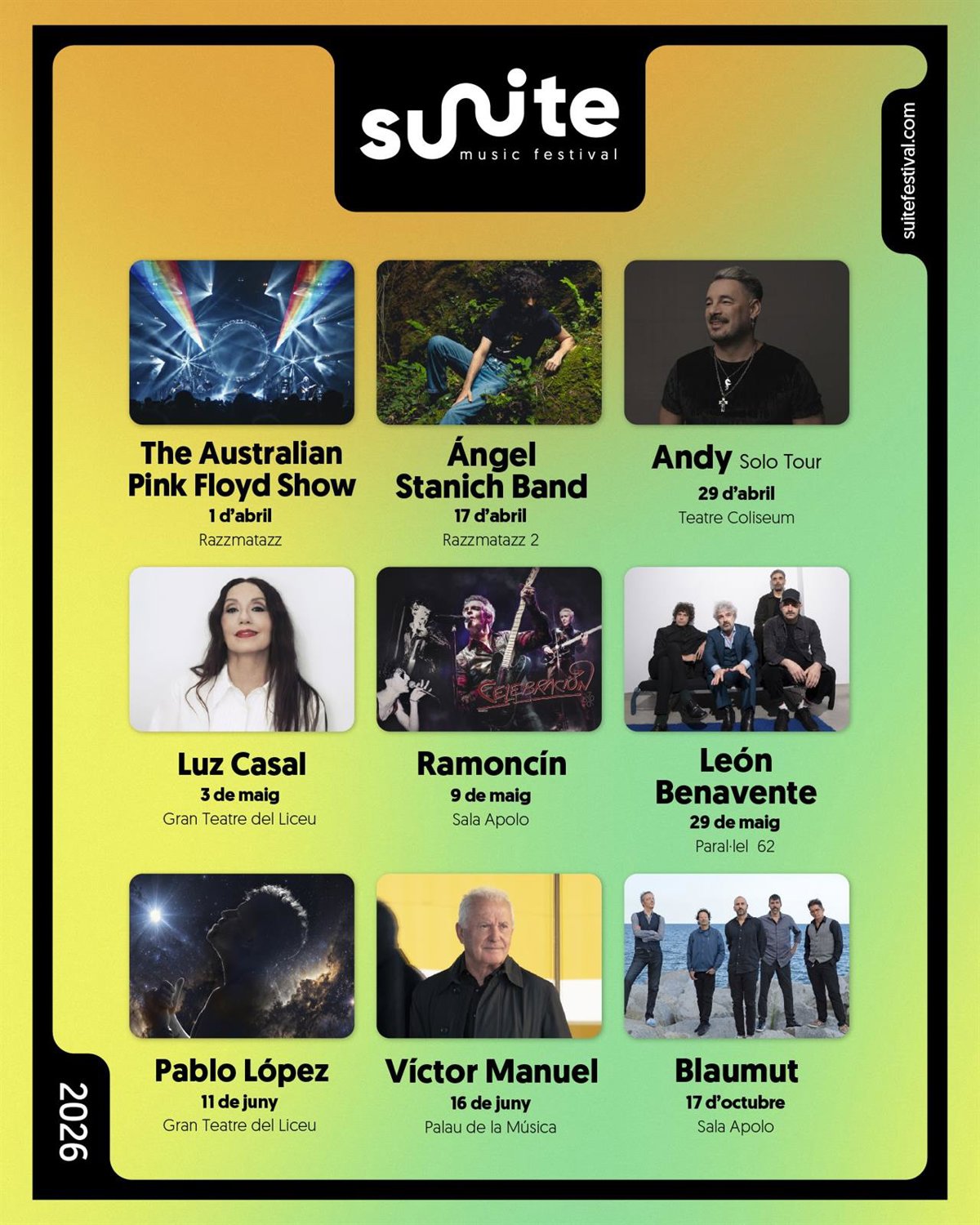 Estos anuncios se suman a una programación "ya consolidada" que incluye propuestas como el espectáculo tributo The Australian Pink Floyd Show (1 de abril en Razzmatazz), Ángel Stanich Band (17 de abril en Razzmatazz 2), Andu con su 'Solo Tour' (29 de abril en el Teatre Coliseum); Luz Casal (el 3 de mayo en el Gran Teatre del Liceu) o Pablo López (el 11 de junio también en el Liceu).