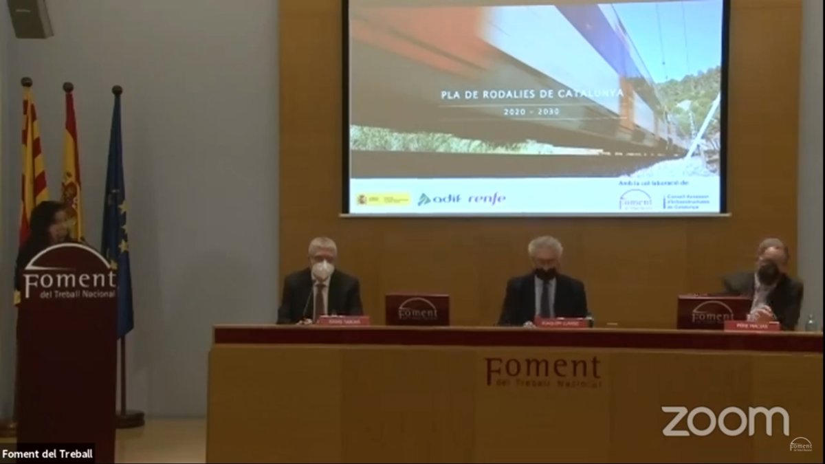 El presidente de Renfe, Isaías Táboas, junto con el presidente de Foment del Treball, Josep Sánchez Llibre, y el coordinador del plan, Pere Macias, durante la presentación. - EUROPA PRESS