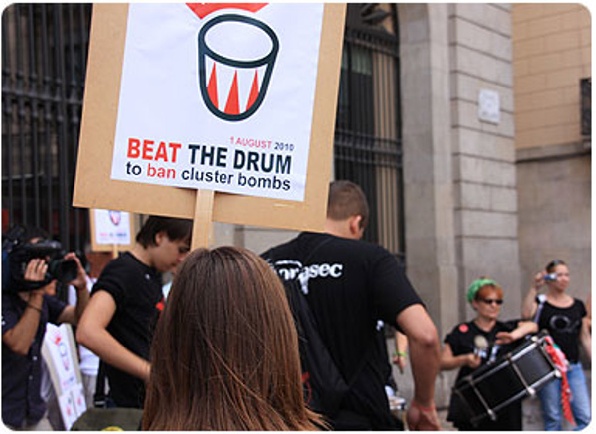 Un centenar de personas convocadas por varias ONG han organizado este domingo en la Plaza Sant Jaume de Barcelona una tamborada para celebrar la entrada en vigor del Tratado de Prohibición de las bombas de racimo (de dispersión), que prohíbe su uso, fabricación, venta y almacenaje.