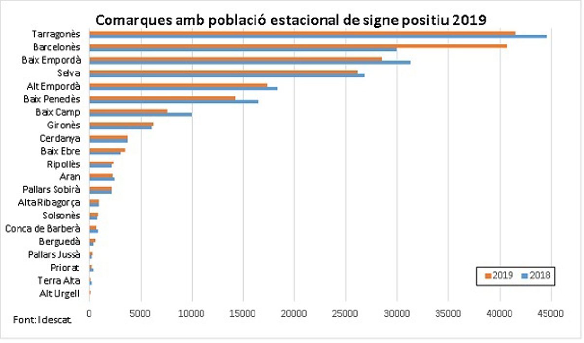 El Tarragons es la comarca en términos absolutos con más población estacional de Catalunya en 2019, con 41.536 personas, según el Institut d'Estadística de Catalunya (Idescat), y la siguen el Barcelons, con 40.657, el Baix Empord (Girona), con 28.475 y La Selva, con 26.089.