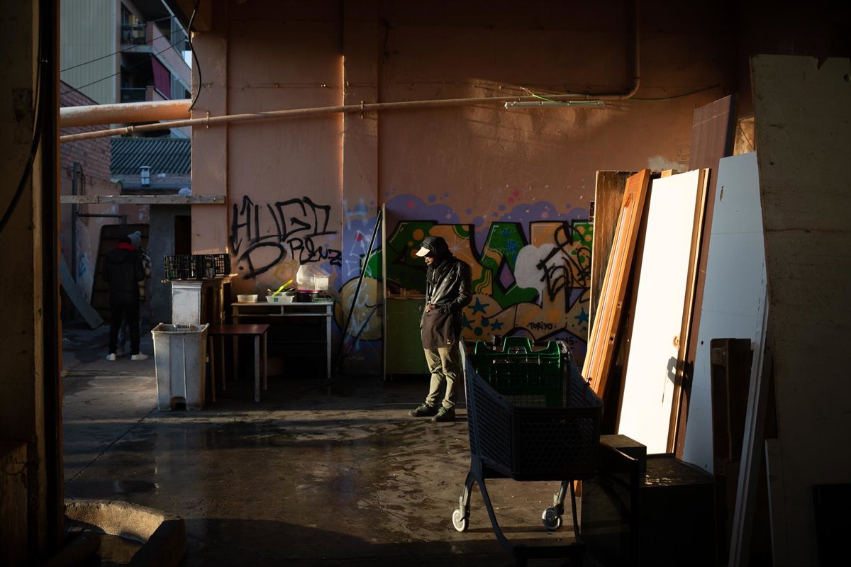 Un hombre en el interior de una nave industrial en desuso ocupada en la calle Progrés de Badalona - David Zorrakino - Europa Press
