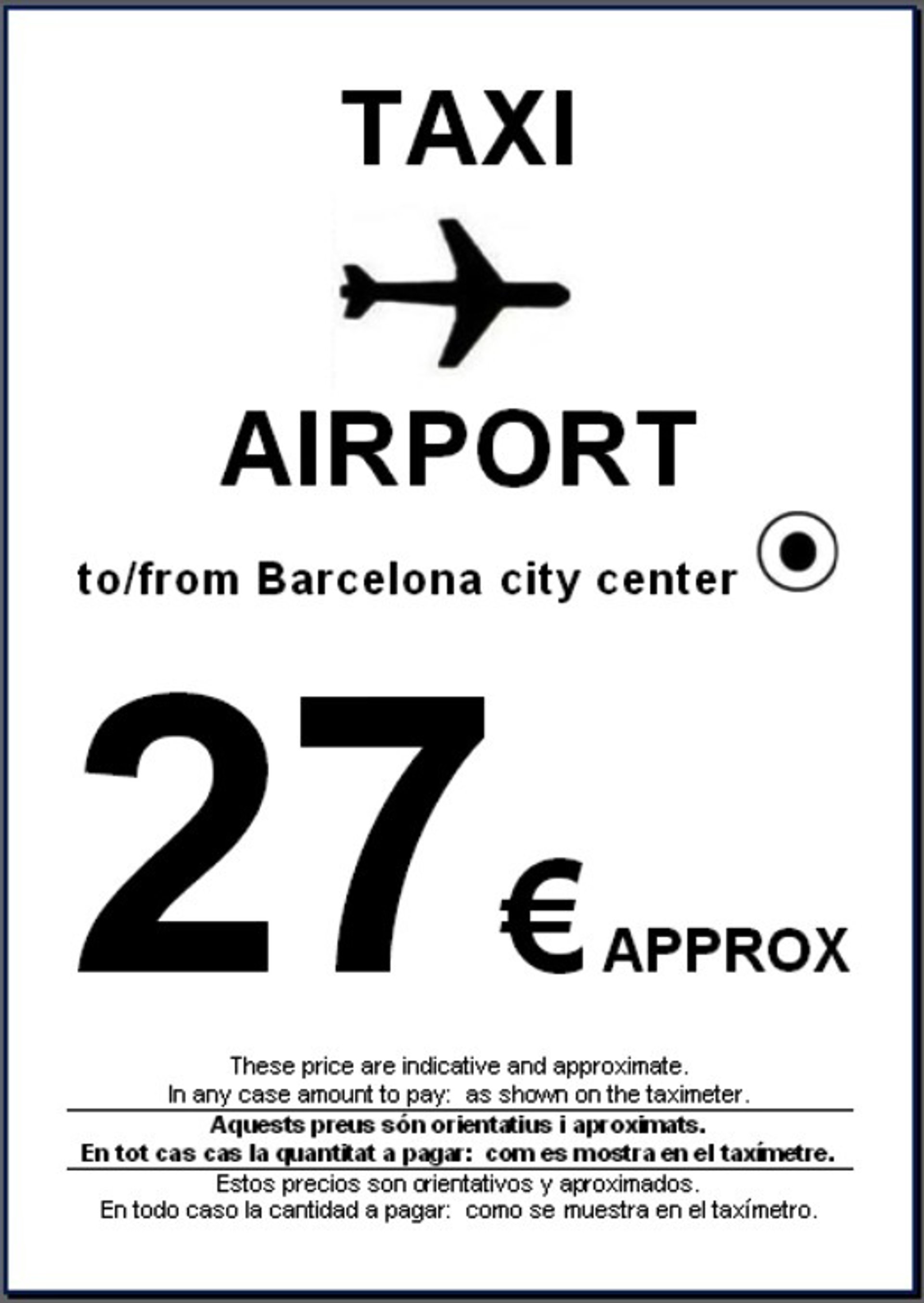 Los carteles --en inglés, catalán y castellano-- destacan la cifra y en letra pequeña señalan que los precios son "orientativos y aproximados", y que en todo caso la cantidad a pagar es la que marque el taxímetro.