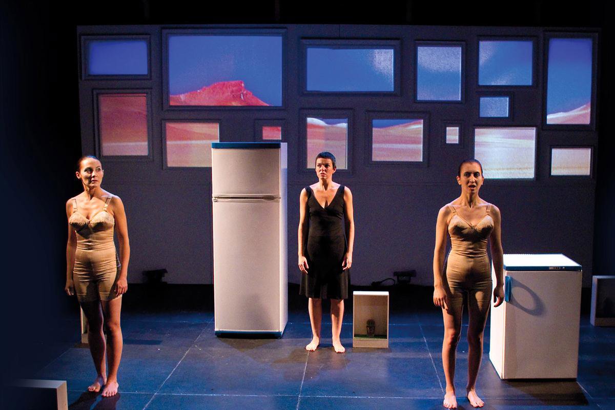 La escenografía busca deliberadamente transmitir una sensación de frío y vacío; hay tres neveras blancas que se convierten en mesas, camillas y máquinas de coser, además de un suelo repleto de retales de telas de colores fríos.