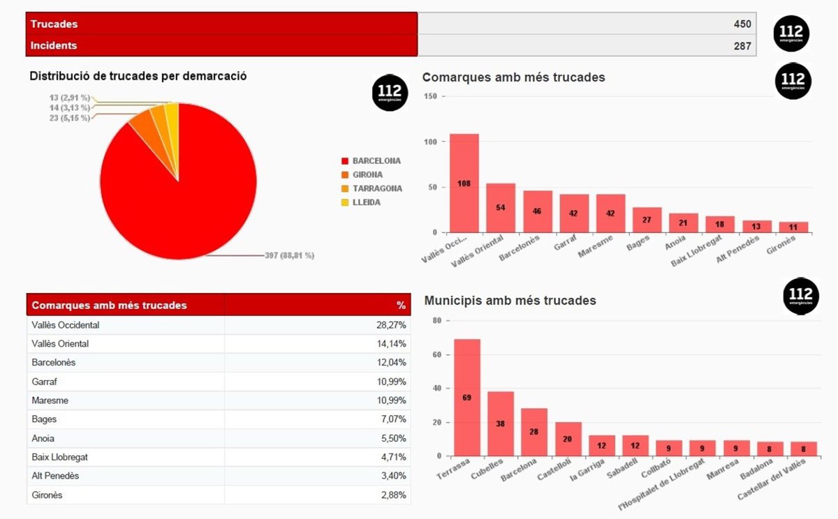 Las comarcas que más han llamado al teléfono de emergencias son el Vallès Occidental (108), el Vallès Oriental (54) y el Barcelonès (46).