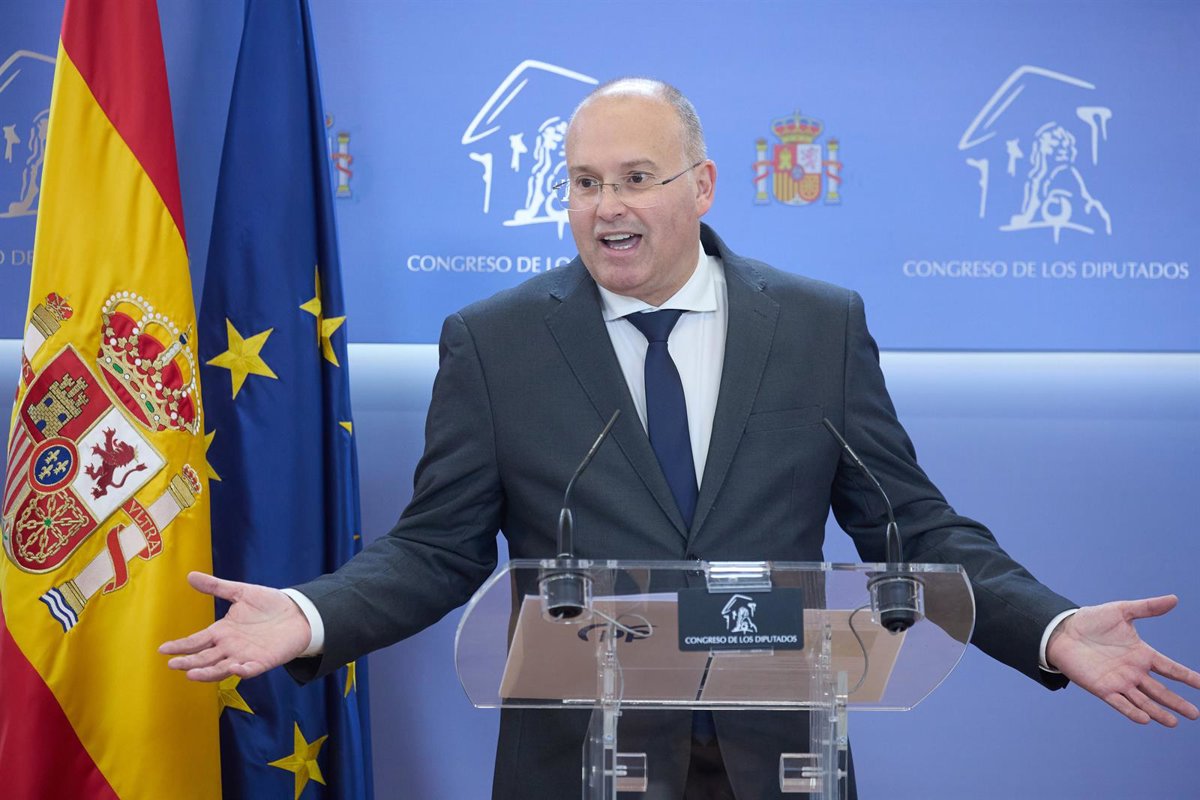 El portavoz del PP en el Congreso, Miguel Tellado, durante una rueda de prensa anterior a la Junta de Portavoces, en el Congreso de los Diputados, a 6 de mayo de 2025, en Madrid (España). - Jesús Hellín - Europa Press