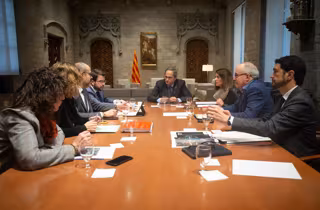 Los consellers Teresa Jord, ngels Chacón, Miquel Buch, Meritxell Budó, Josep Bargalló, Dami Calvet; el vicepresidente de la Generalitat, Pere Aragons; el presidente de la Generalitat, Quim Torra, durante la reunión del Govern por el temporal 'Gloria - David Zorrakino - Europa Press