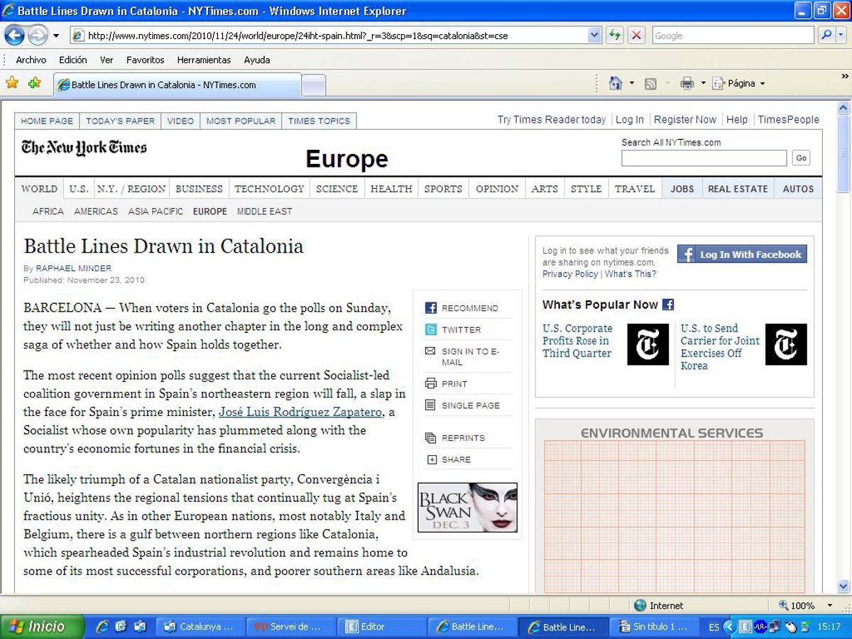 El periódico norteamericano 'The New York Times' advierte de los riesgos que supondría para toda España un gobierno de CiU presidido por Artur Mas.