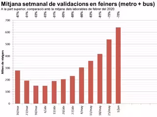 Mientras que la media diaria de la última semana de la fase 0 --del 18 al 22 de mayo-- fue de 417.000 validaciones, la segunda semana de la fase 1 --del 2 al 5 de junio-- se han registrado 642.000 viajes en metro y bus.