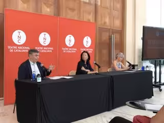 El director artístico del TNC, Xavier Albertí, junto a la presidenta del Consejo de Administración, Neus Aranda, y la directora ejecutiva, Mnica Campos, este lunes en la presentación de la nueva temporada 2020-2021 - EUROPA PRESS