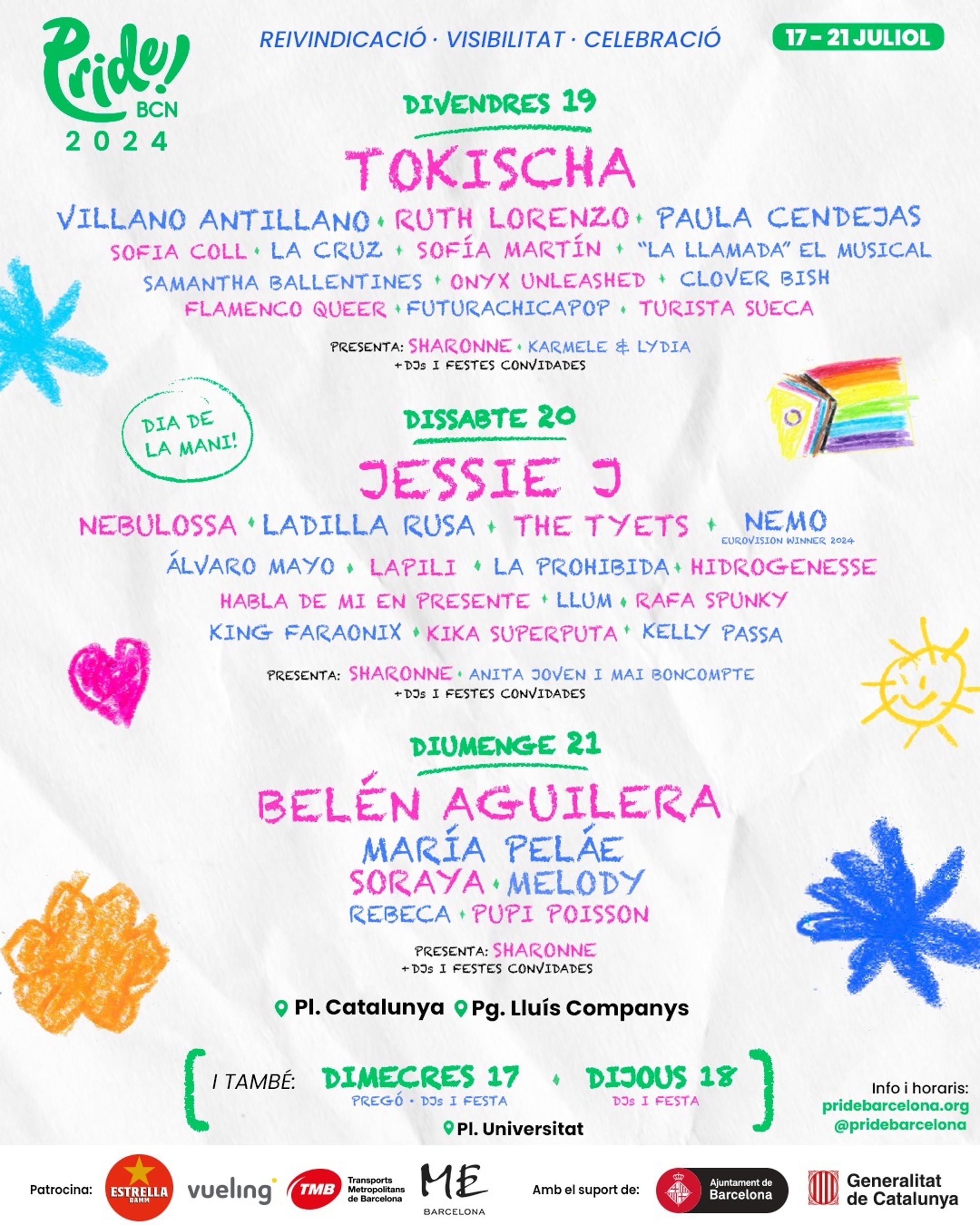 El 20 de julio en el paseo Lluís Companys actuarán Jessie J, Nebulossa, Ladilla Rusa, The Tyets, Nemo, Alvaro Mayo, Lapili, La Prohibida, Hidrogenesse, Habla de Mí en Presente, Llum, Raf, Spunky, King Faraoni, Kika Superputa y Kelly Passa.