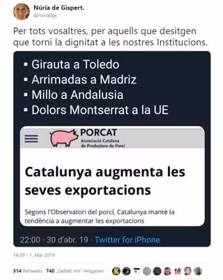 Así se ha pronunciado desde Waterloo después de que De Gispert colgara en su perfil personal de Twitter un mensaje, que ya ha retirado, en el que rezaba: 'Juan Carlos Girauta a Toledo, Inés Arrimadas a 'Madriz', Enric Millo a Andalucía y Dolors Montserrat a la UE' acompañado de una imagen de la Associació Catalana de Productors de Porcí (Porcat), que tiene un cerdo como logo, con el titular 'Catalunya aumenta las exportaciones'.