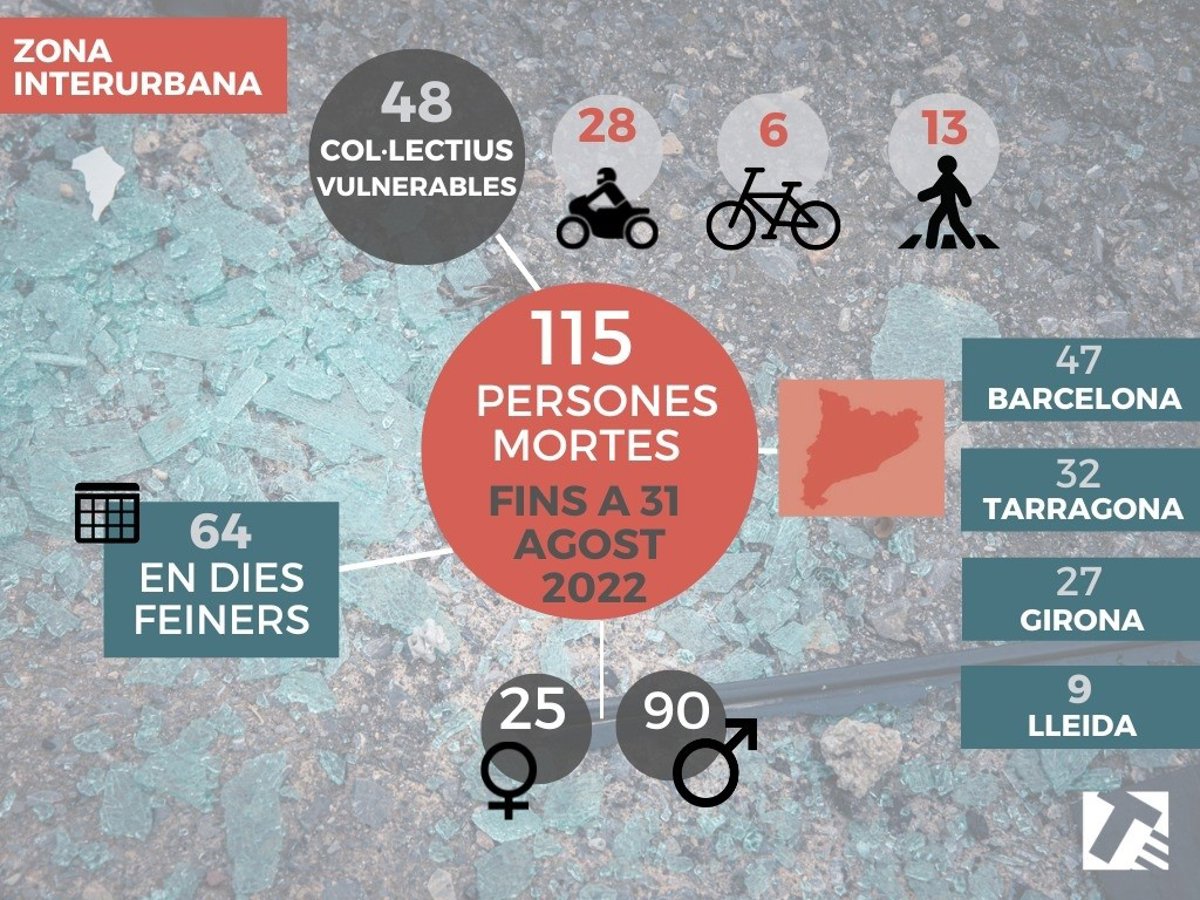 Un total de 115 personas han perdido la vida en carretera en Catalunya hasta agosto de 2022, un 5,7% menos que en 2019, según ha informado el Servei Catal de Trnsit (SCT) en un comunicado este jueves.