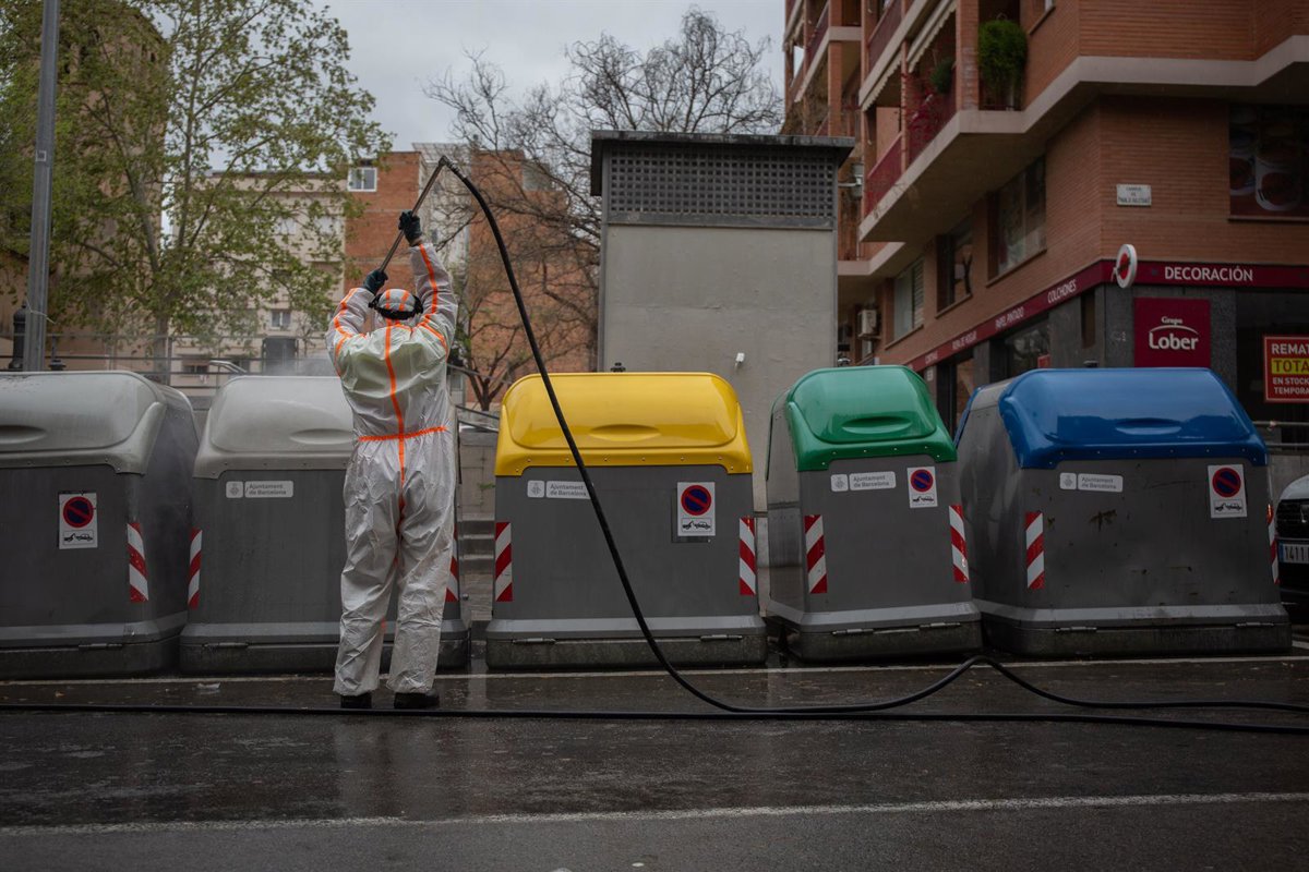 Un trabajador desinfecta y limpia los contenedores de basura de Barcelona durante la tercera semana de confinamiento por la crisis del coronavirus - David Zorrakino - Europa Press