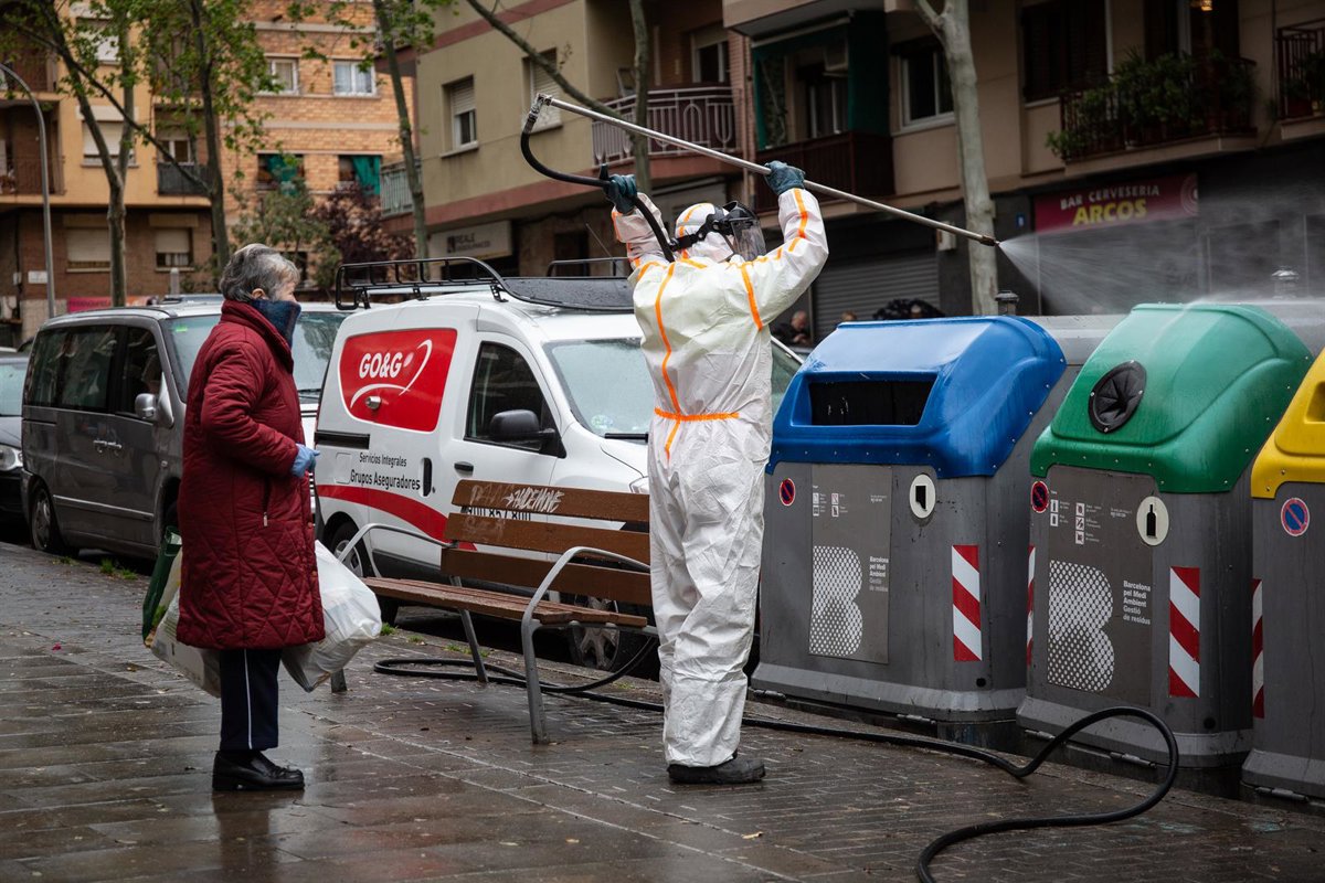 Un trabajador desinfecta y limpia los contenedores de basura de Barcelona durante la tercera semana de confinamiento por la crisis del coronavirus - David Zorrakino - Europa Press