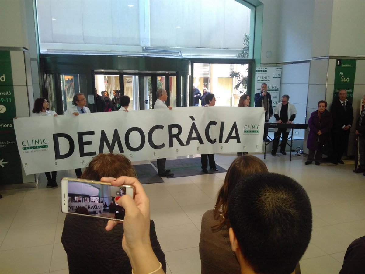 Un centenar de trabajadores del Hospital Clínic de Barcelona se han concentrado este mediodía en el vestíbulo del centro para pedir la libertad de los presos soberanistas y han desplegado una pancarta con el lema 'Democracia'.