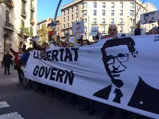 Los manifestantes, que se han concentrado sobre las 10.30 horas, han desplegado una pancarta con el mensaje: 'Libertad Govern. Libertad Jordis. Os queremos en casa', y con las imágenes de un lazo amarillo y el rostro de Mundó.