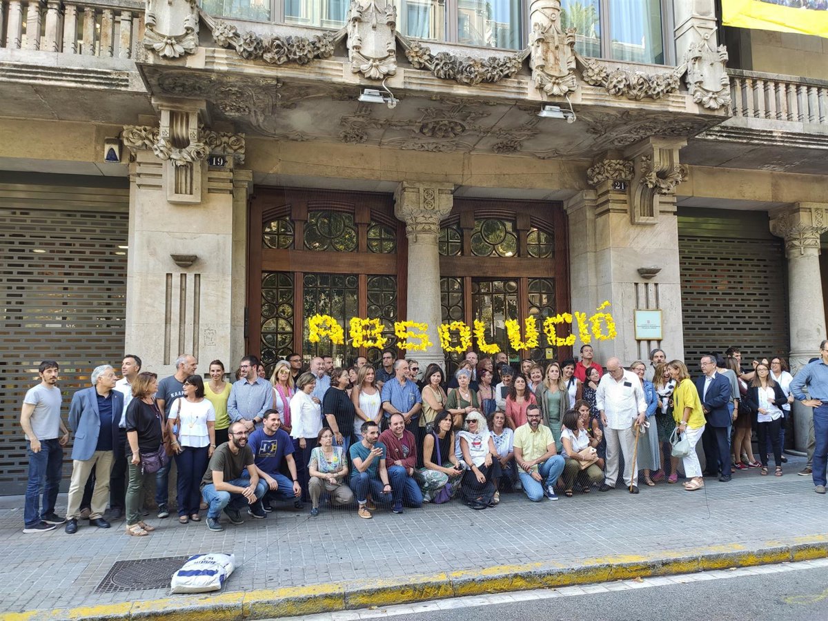 Los trabajadores han colocado en la fachada de la Conselleria unas flores amarillas en las que se puede leer el mensaje 'Absolución', han gritado 'Llibertat presos polítics' y han cantado Els Segadors.