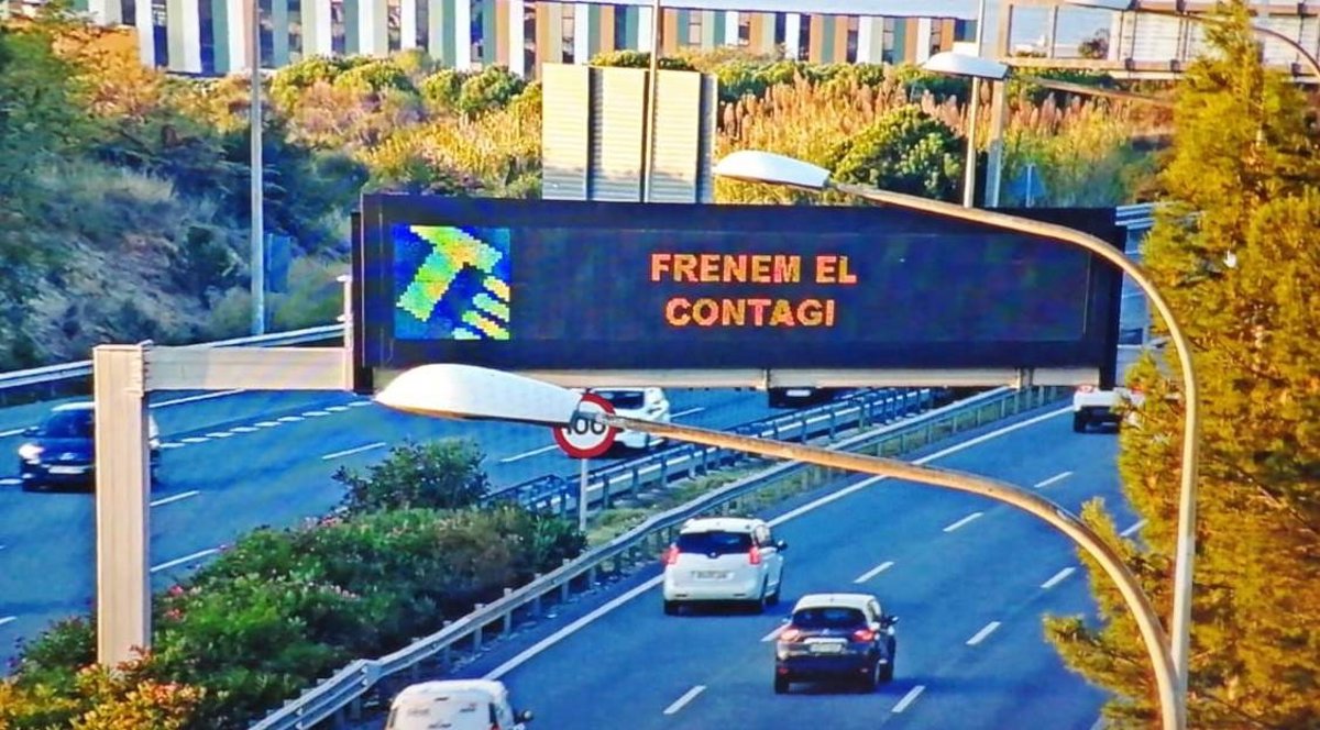 Un panel informativo en una carretera con el texto 'Frenem el contagi' (Frenemos el contagio) el primer fin de semana de confinamiento municipal en Catalunya para contener el coronavirus. El 30 de octubre de 2020. - @TRANSIT