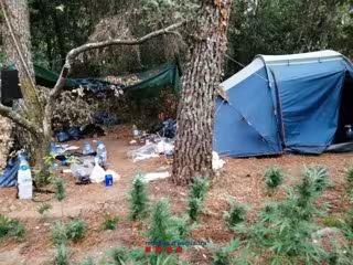 Para llegar a la plantación había que cruzar un sendero estrecho que cruza el bosque y al desmantelarla encontraron una tienda de campaña y un toldo que hacían las funciones de cocina y almacén, una mesa de camping, agua, comida y un hornillo de camping.