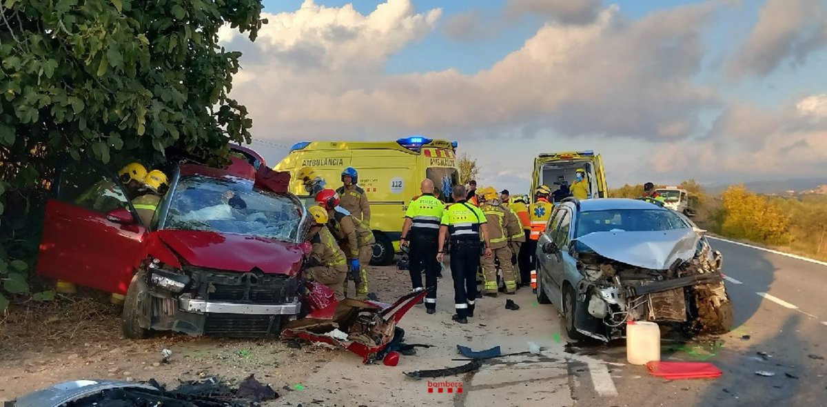 El teléfono 112 ha recibido el aviso a las 17.41 horas y hasta el lugar se han desplazado cuatro dotaciones de los Bombers de la Generalitat, que han rescatado a los heridos, que habían quedado atrapados en el interior de los vehículos.