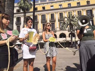 Antes de las declaraciones, Ferrero y otros miembros del sindicato han protagonizado una acción reivindicativa en la Plaza Real de Barcelona para criticar que los becarios son los nuevos "esclavos" de la economía.