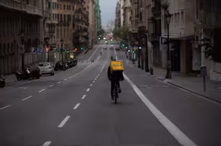Un trabajador de Glovo en bicicleta porBarcelona, prácticamente vacía durante el primer día laborable de la segunda semana desde que se decretó el estado de alarma a consecuencia del coronavirus, en Barcelona/Catalunya (España) a 23 de marzo de 2020. - David Zorrakino - Europa Press