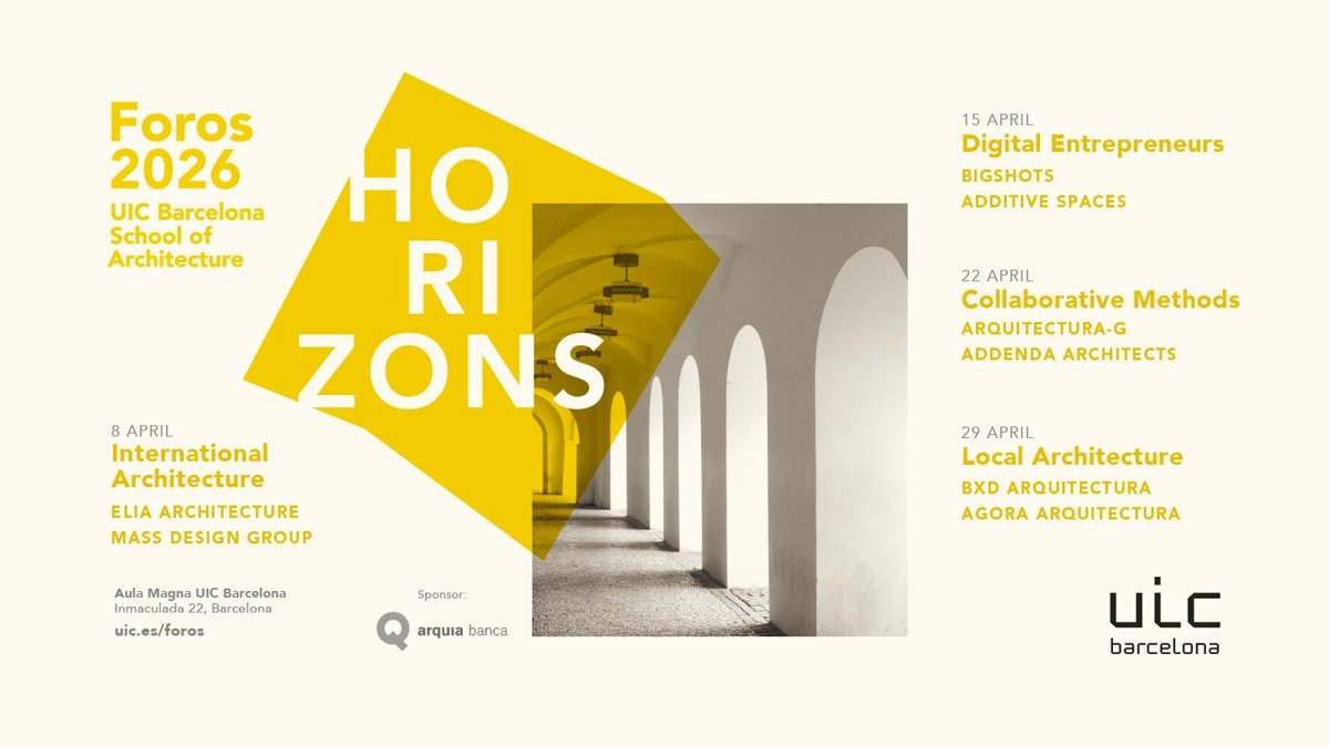 UIC Barcelona School of Architecture reunirá a arquitectos de "reputados estudios nacionales e internacionales" con estudiantes de Arquitectura en el ciclo de conferencias Foros 2026, que se celebrará el 8, 15, 22 y 29 de abril en el Aula Magna de UIC Barcelona.