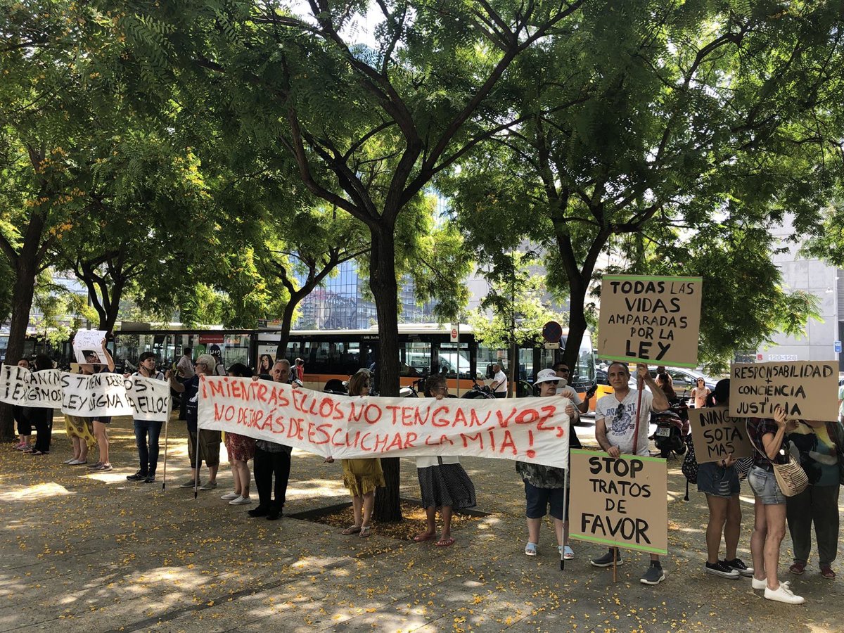 A las puertas de la Ciutat de la Justícia se han concentrado una veintena de personas al grito 'Justicia para Sota' y con pancartas con mensajes como '¡Mientras ellos no tengan voz, no dejarás de escuchar la mía!' y 'Todas las vidas amparadas por la ley'.